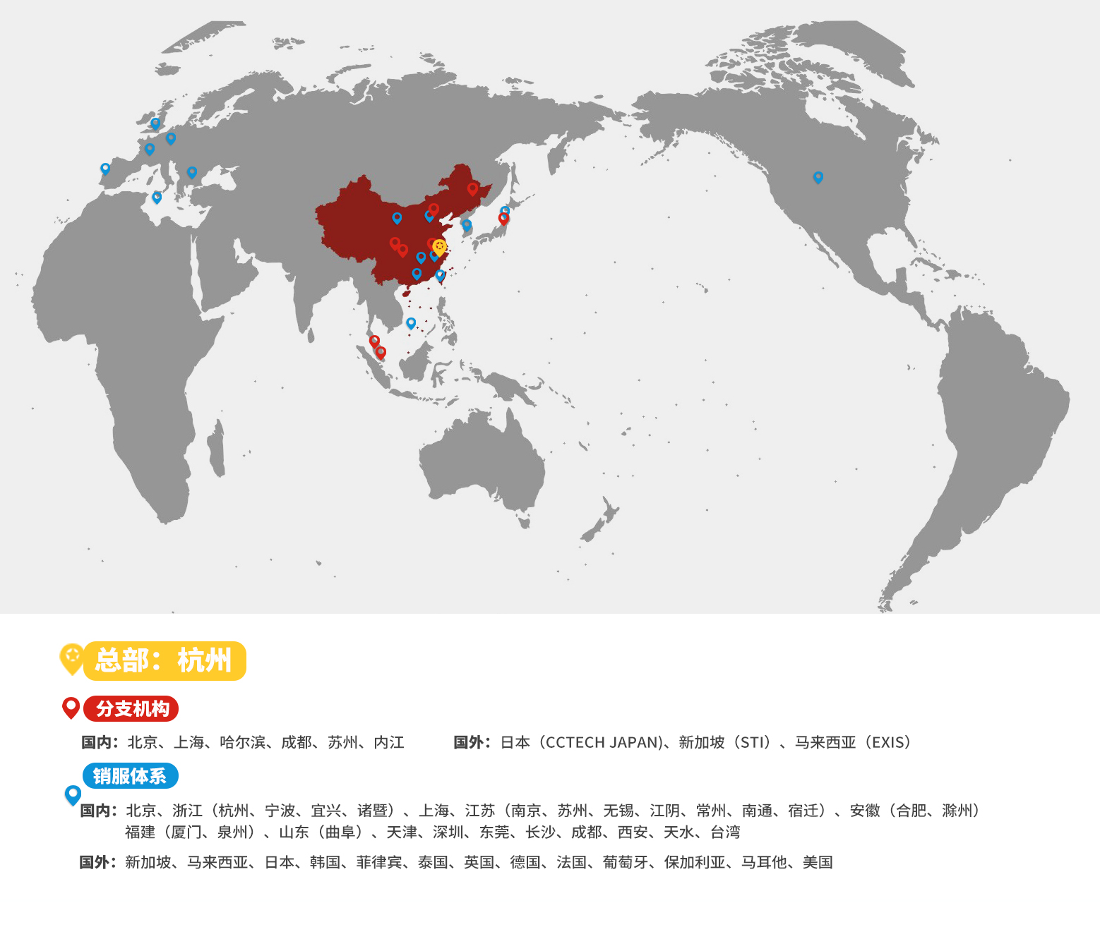 公司總部位于杭州市濱江區(qū)創(chuàng)智街500號(hào)。目前,公司員工超4000人,研發(fā)人員占比55%以上,在日本、上海、北京、成都、哈爾濱、蘇州、內(nèi)江、長(zhǎng)沙、合肥等地設(shè)有分支機(jī)構(gòu),并先后并購(gòu)新加坡AOI設(shè)備制造商STI、日本SATO公司半導(dǎo)體事業(yè)部和馬來(lái)西亞測(cè)試設(shè)備制造商EXIS。在深耕中國(guó)大陸、臺(tái)灣地區(qū)市場(chǎng)的同時(shí),公司海外市場(chǎng)已開拓至美國(guó)、英國(guó)、德國(guó)、韓國(guó)、新加坡,馬來(lái)西亞、泰國(guó)、菲律賓等國(guó)家,逐步形成全球化布局。